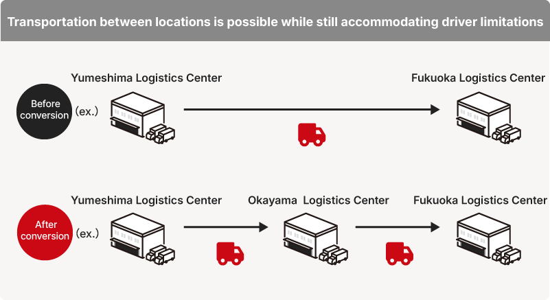 This service allows customers such as food manufacturers and wholesalers to reduce transportation and labor costs, while also shortening transportation distances, cutting CO2 emissions, and helping to alleviate driver shortages.