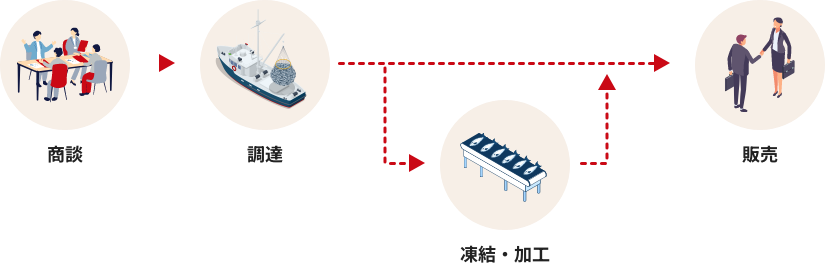 国内外の産地から⾼品質な⽔産品・畜産品・農産品を調達し、商社、仲卸業者、⾷品メーカー、外⾷産業、流通チェーンなどの事業者に向けて安定的に供給しています。