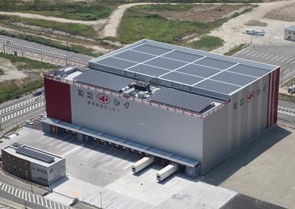 同センターは、最新鋭の冷却設備を備えた環境にやさしい冷蔵倉庫として、2014年7月より稼働。冷却設備には産業用省エネ型ノンフロン冷凍装置(NewTon)を導入。冷却時の廃熱を利用するハイブリッドデシカント陽圧式低温プラットホームなど、環境に配慮した最新鋭の技術を駆使しています。また、施設屋上には、業界最大規模となる発電能力630kWの太陽光発電システムを設置。自社利用の他に、営業冷蔵庫初となる売電も行っています。