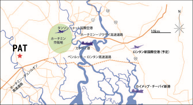 フーアンタン工業団地はホーチミン市南西部のロンアン省に位置し、チュンルオン高速道路より約 7分、ホーチミン市中心部より約60分、ホーチミン市のコンテナターミナルであるカトライ港(将来は国内航路)より約70分という好立地にあります。ベトナム南西部のメコンデルタ地区とホーチミン市を繋ぐ物流拠点となっており、2025年にはベンルック―ロンタン間を結ぶ高速道路が開通予定です。同高速道路が開通することにより、ベトナム南部最大の国際コンテナターミナルであるカイメップ・チーバイ港へのアクセスが容易となり、更なる利便性の向上が期待される場所となっております。