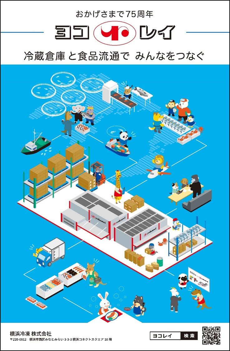 「冷蔵倉庫と食品流通でみんなをつなぐ」というメインコピーとともに、当社の事業内容が分かりやすく伝えられるよう、食材の調達から消費者のもとに届くまでの流れを表現しています。少しでも親しみやすいデザインにしたいという思いから誕生した可愛い動物たちがポイントです。