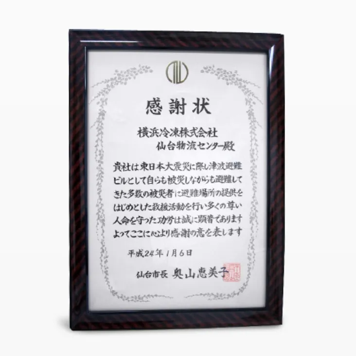東日本大震災に際し、避難場所の提供をはじめとした救援活動を行い、多くの人命を守った功績とそれに伴う労苦を評価され、仙台市より弊社仙台物流センターへ感謝状が贈られました。